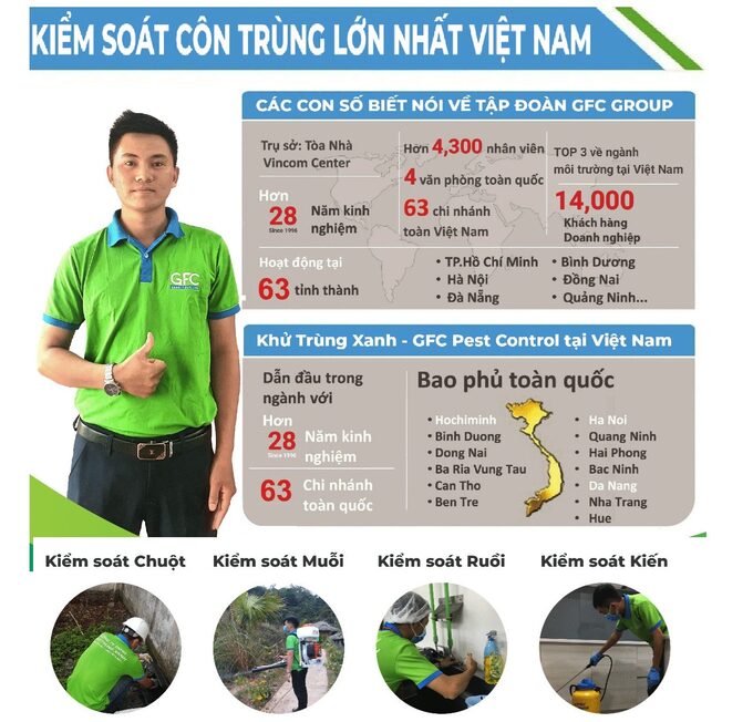 Công ty diệt côn trùng GFC chuyên cung cấp các dịch vụ diệt côn trùng và sinh vật gây hại theo chuẩn quốc tế IPM thuộc Tập Đoàn GFC (GFC GROUP). GFC có 8 văn phòng đại diện và có trụ sở tại tòa nhà Vincom Đồng Khởi, Quận 1, TPHCM và Tòa nhà Licogi 13 ,Quận Thanh Xuân, Hà Nội.