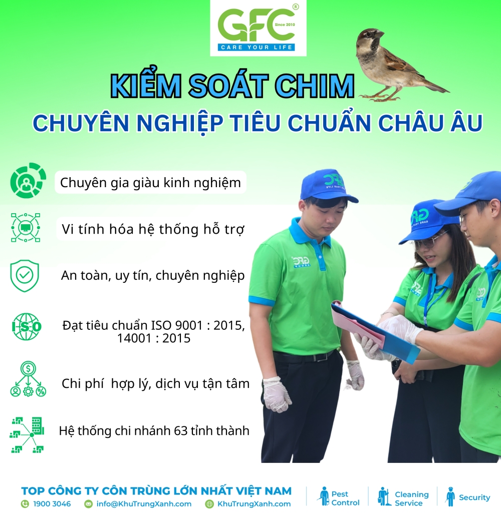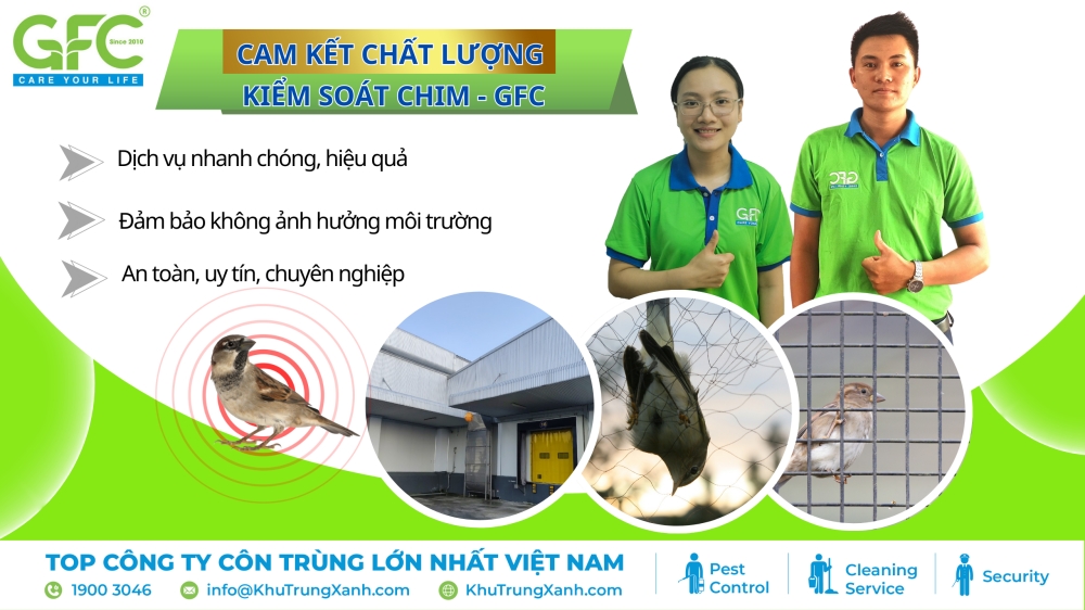 GFC cam kết cung cấp dịch vụ Kiểm soát chim chuyên nghiệp, với các phương pháp tiên tiến nhằm loại bỏ triệt để Kiểm soát chim. Đội ngũ chuyên gia của GFC không chỉ tiêu diệt hết mối mà còn thực hiện công tác dọn dẹp kỹ lưỡng, tạo không gian sạch sẽ và an toàn cho khách hàng.
