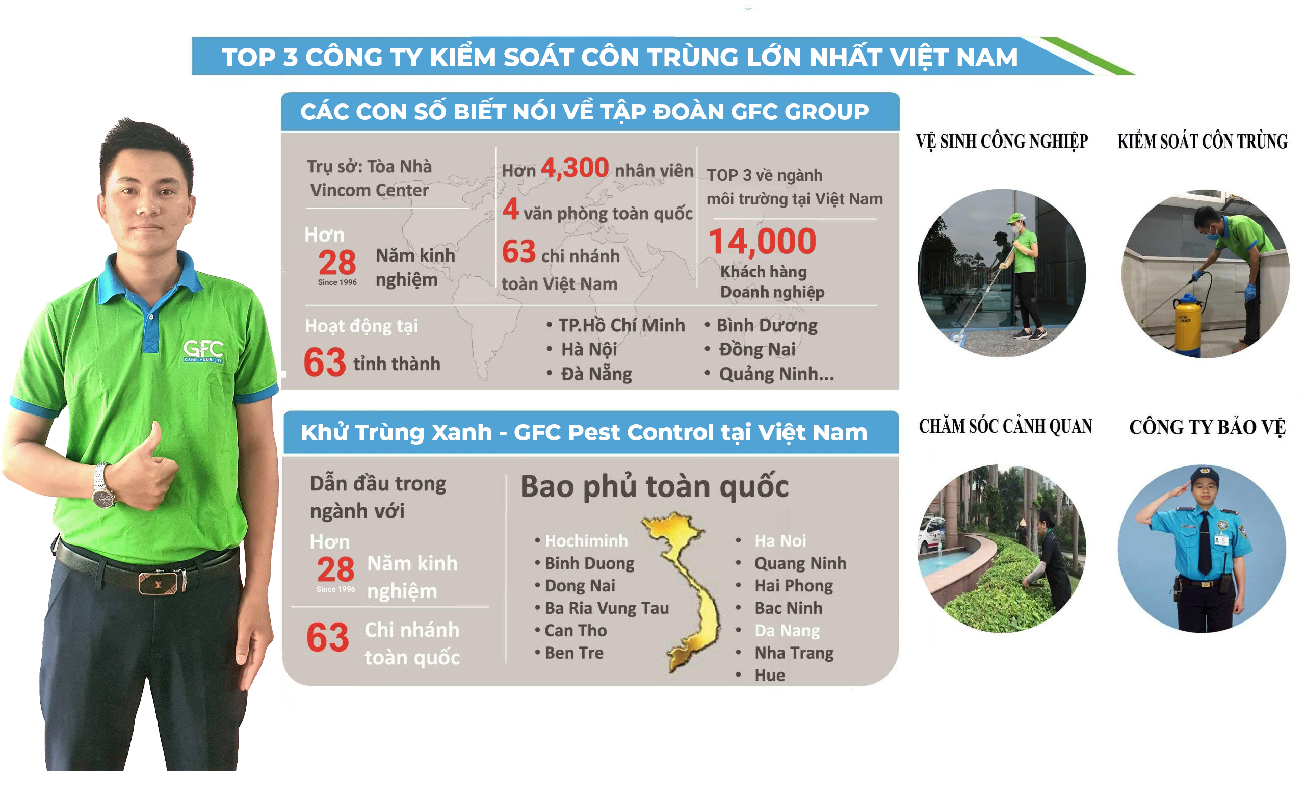 Nhờ vào sự chuyên nghiệp và hiệu quả của hơn 4,300 nhân viên, GFC đã trở thành một trong những công ty dẫn đầu trong lĩnh vực diệt côn trùng tại TPHCM ,Hà Nội và cả nước. Chúng tôi cam kết mang lại dịch vụ diệt côn trùng uy tín và chất lượng cao nhất, không chỉ tại TPHCM mà còn trên toàn quốc.